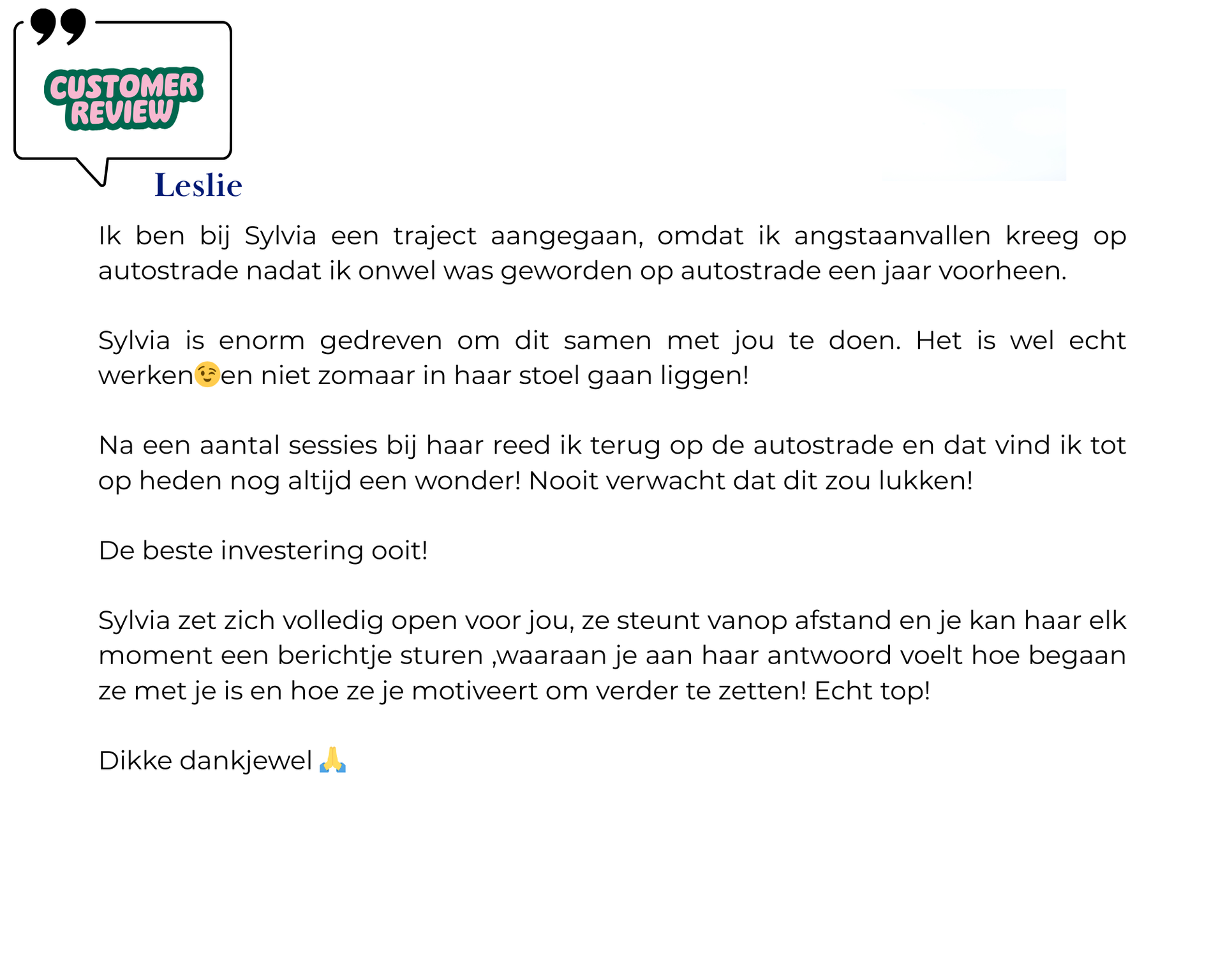 Als angst therapeut begeleid ik je stap voor stap van start tot transformatie, ruimschoots bewezen door vele cliënten die jou reeds voor gingen. Lees de ervaringen van mijn cliënten in de Google recensies via de link onderaan de pagina.